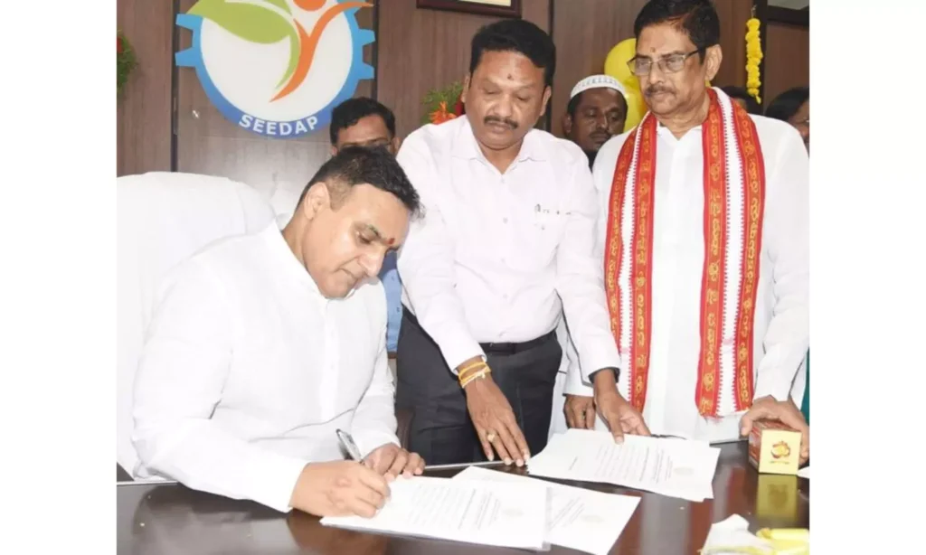విజయవాడ: సొసైటీ ఫర్ ఎంప్లాయ్మెంట్ జనరేషన్ అండ్ ఎంటర్ప్రైజ్ డెవలప్మెంట్ ఇన్ ఆంధ్రప్రదేశ్ (సీడాప్) చైర్మన్గా దీపక్ రెడ్డి గుణపతి బాధ్యతలు చేపట్టారు. సీడాప్ యువతను పరిశ్రమలకు సిద్ధం చేసేందుకు శిక్షణ ఇవ్వడంపై దృష్టి సారిస్తుందని ఆయన పేర్కొన్నారు. సోమవారం విజయవాడలోని ఎన్టీఆర్ అడ్మినిస్ట్రేటివ్ బ్లాక్లో వేదపండితుల మంత్రోచ్ఛారణల మధ్య రెడ్డి బాధ్యతలు స్వీకరించారు.