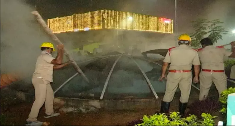 భువనేశ్వర్‌లోని యూనిట్-1 మార్కెట్‌లో గురువారం అర్థరాత్రి అగ్నిమాపక సిబ్బంది మంటలను ఆర్పుతున్నారు.