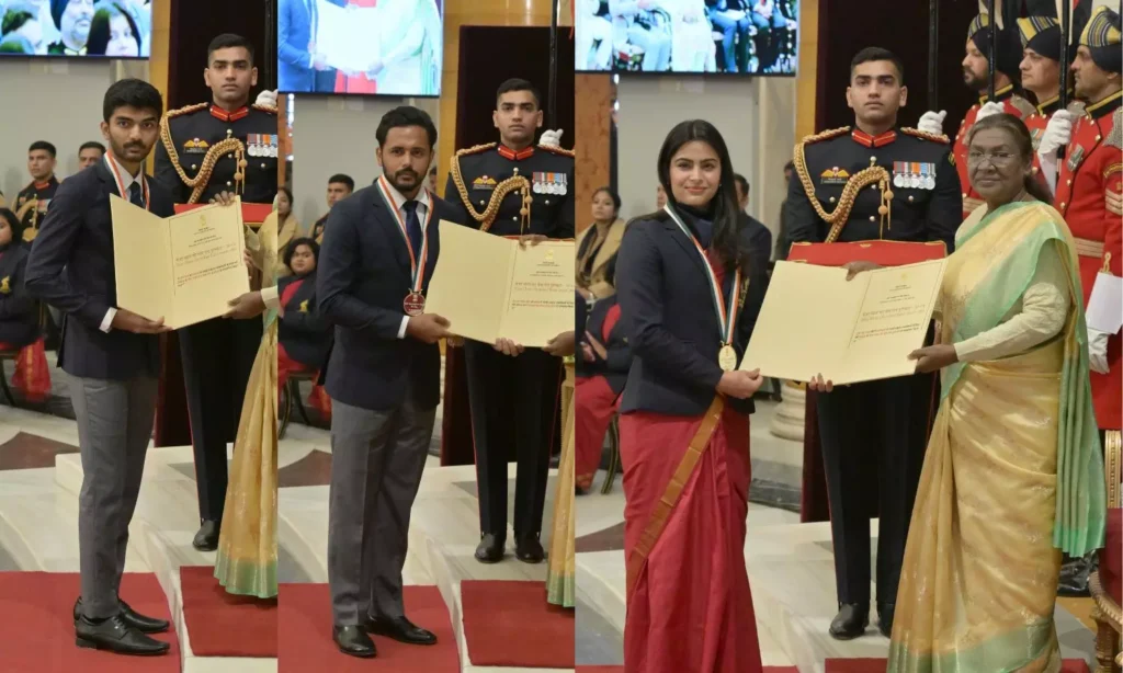 డబుల్ ఒలింపిక్ పతక విజేత మను భాకర్, ప్రపంచ చెస్ ఛాంపియన్ గుకేశ్ దొమ్మరాజు, భారత పురుషుల హాకీ జట్టు కెప్టెన్ హర్మన్ప్రీత్ సింగ్, పారా అథ్లెట్ ప్రవీణ్ కుమార్లకు భారత రాష్ట్రపతి ద్రౌపది ముర్ము శుక్రవారం రాష్ట్రపతి భవన్లో ప్రతిష్టాత్మక మేజర్ ధ్యాన్ చంద్ ఖేల్ రత్న అవార్డును ప్రదానం చేశారు.