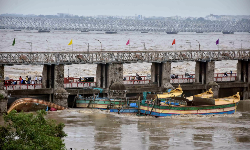 ప్రకాశం బ్యారేజీ 69వ నంబర్‌ గేట్‌ను ఇసుక పడవలు ఢీకొనగా, సోమవారం విజయవాడలో నీటిపారుదలశాఖ అధికారులు 11.24 లక్షల క్యూసెక్కుల వరద నీటిని విడుదల చేశారు. (చిత్రం)