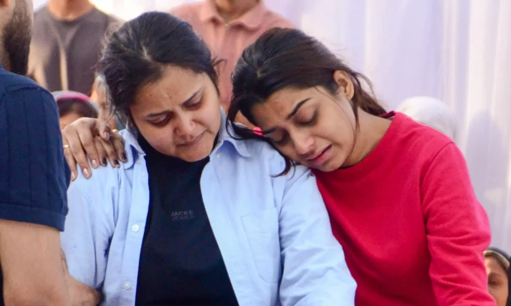 పహల్గామ్ ఉగ్రవాద దాడి బాధితుడు శుభం ద్వివేది భౌతికకాయాన్ని కాన్పూర్లోని అతని నివాసానికి తీసుకువచ్చిన తర్వాత అతని భార్య, నీలిరంగు చొక్కా ధరించి, అతని సోదరి విలపిస్తున్నారు.