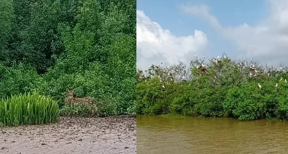 ఒడిశాలోని భితార్కనికా జాతీయ ఉద్యానవనం, స్పష్టమైన ఆకాశం కింద సేదతీరుతున్న దృశ్యం, పక్షులు ఉత్సాహభరితమైన మడ అడవుల మధ్య ఆశ్రయం పొందుతున్నాయి.