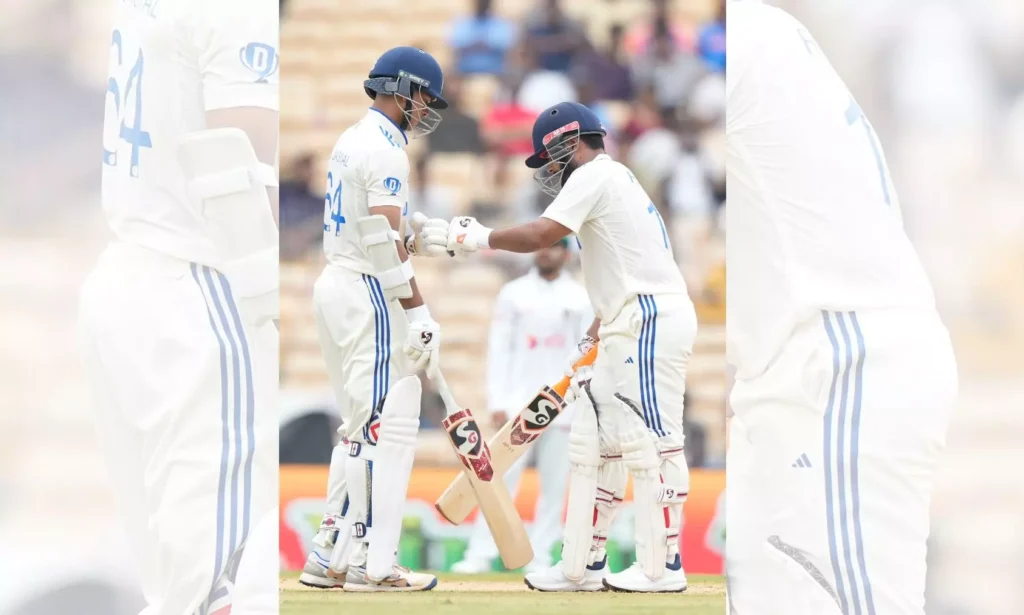 భారతదేశం యొక్క యశస్వి జైస్వాల్ (ఎడమ), రిషబ్ పంత్ ఒకరినొకరు ప్రోత్సహిస్తూ, భారతదేశం మరియు బంగ్లాదేశ్ మధ్య చెన్నై, భారతదేశంలో, సెప్టెంబర్ 19, 2024 గురువారం జరిగిన మొదటి క్రికెట్ టెస్ట్ మ్యాచ్ మొదటి రోజు బ్యాటింగ్ చేస్తున్నారు.