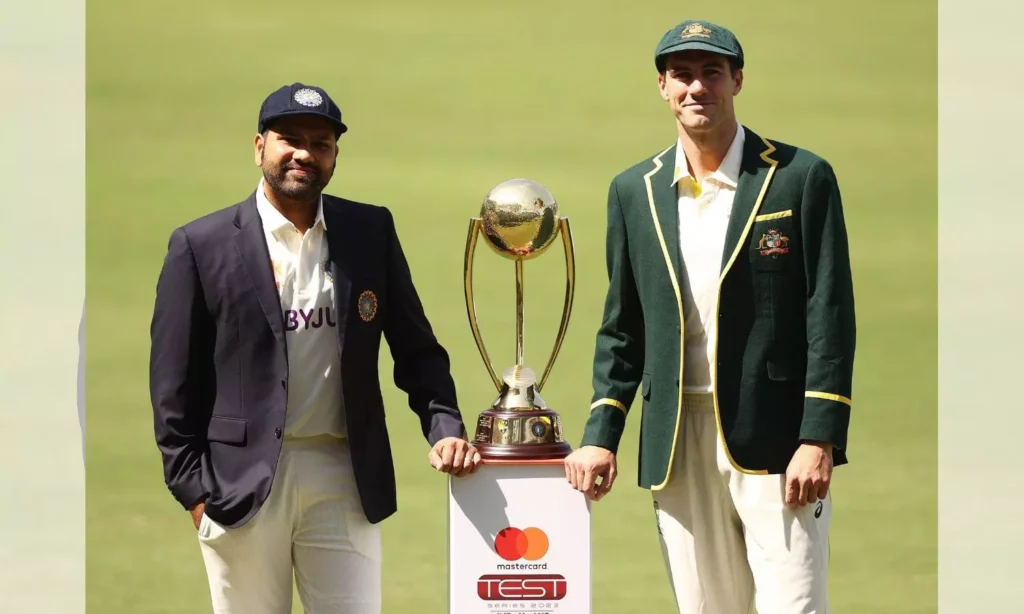 2023లో బోర్డర్-గవాస్కర్ ట్రోఫీతో టీమ్ ఇండియా కెప్టెన్ రోహిత్ శర్మ మరియు ఆస్ట్రేలియా కెప్టెన్ పాట్ కమిన్స్ పోజులిచ్చారు.