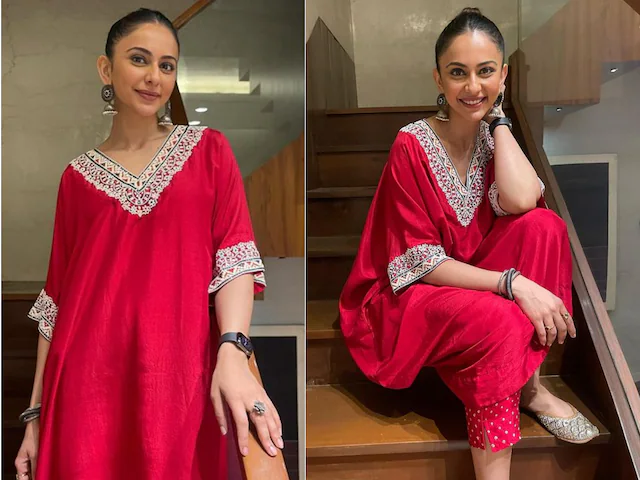 సాంప్రదాయ అప్పీల్ను స్వీకరించి, రకుల్ ప్రీత్ సింగ్ ఎరుపు రంగులో ప్రకాశవంతమైన షేడ్లో రూపొందించబడిన సూట్ సెట్ను ఎంచుకుంది. సారిక ద్వారా పింక్ సిటీ బ్రాండ్ నుండి ఎంపిక చేయబడింది, ఈ బృందం ఒక జత బంధాని ప్యాంటుతో కూడిన కఫ్తాన్ను కలిగి ఉంది. ప్రకాశవంతమైన ఎరుపు పట్టు వస్త్రం నెక్లైన్ మరియు స్లీవ్లపై క్లిష్టమైన పూసల ఎంబ్రాయిడరీకి సరైన కాన్వాస్ను అందించింది. ఇంకా, కుర్తా, V-నెక్లైన్ మరియు త్రీ-ఫోర్త్ స్లీవ్ల యొక్క రిలాక్స్డ్ సిల్హౌట్, స్టైలిష్ అప్పీల్తో రాజీపడకుండా, సౌకర్యం కోసం రకుల్కు ఉన్న నేర్పును తెలియజేస్తుంది.