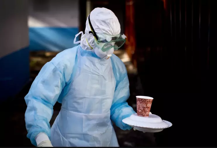 కెన్యాలోని నైరోబీలోని కెన్యాట్టా నేషనల్ హాస్పిటల్లో మార్బర్గ్ వైరస్ క్యారియర్తో పరిచయం ఏర్పడిన తర్వాత ఒక వ్యక్తిని నిర్బంధించబడిన ఐసోలేషన్ టెంట్కి ఒక వైద్య కార్యకర్త భోజనాన్ని తీసుకువెళతాడు.