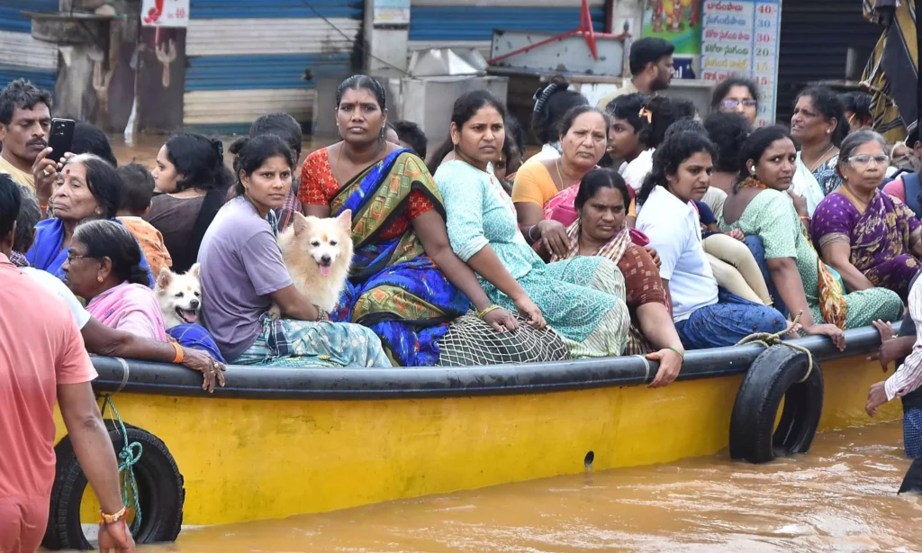 మంగళవారం విజయవాడలోని సింగ్నగర్ వద్ద వరదనీటితో నందమూరినగర్, వాంబే కాలనీ ప్రాంతాల నుంచి బయటకు వస్తున్న ప్రజలు.