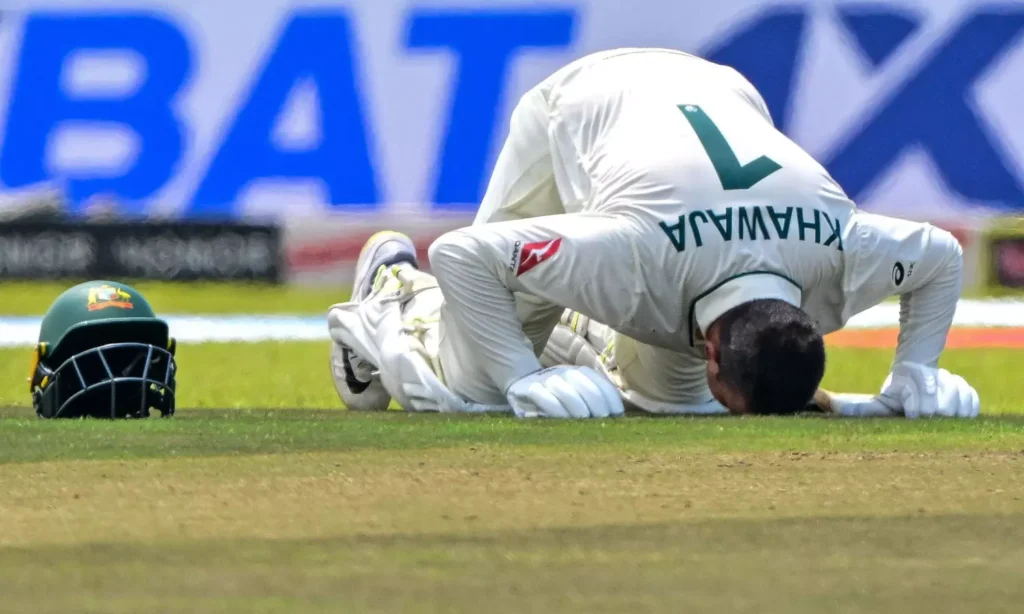 జనవరి 30, 2025న గాలేలోని గాలే ఇంటర్నేషనల్ క్రికెట్ స్టేడియంలో శ్రీలంక మరియు ఆస్ట్రేలియా మధ్య జరిగిన మొదటి టెస్ట్ క్రికెట్ మ్యాచ్ రెండో రోజు సందర్భంగా ఆస్ట్రేలియా ఆటగాడు ఉస్మాన్ ఖవాజా డబుల్ సెంచరీ (200 పరుగులు) సాధించిన తర్వాత సంబరాలు చేసుకున్నాడు.